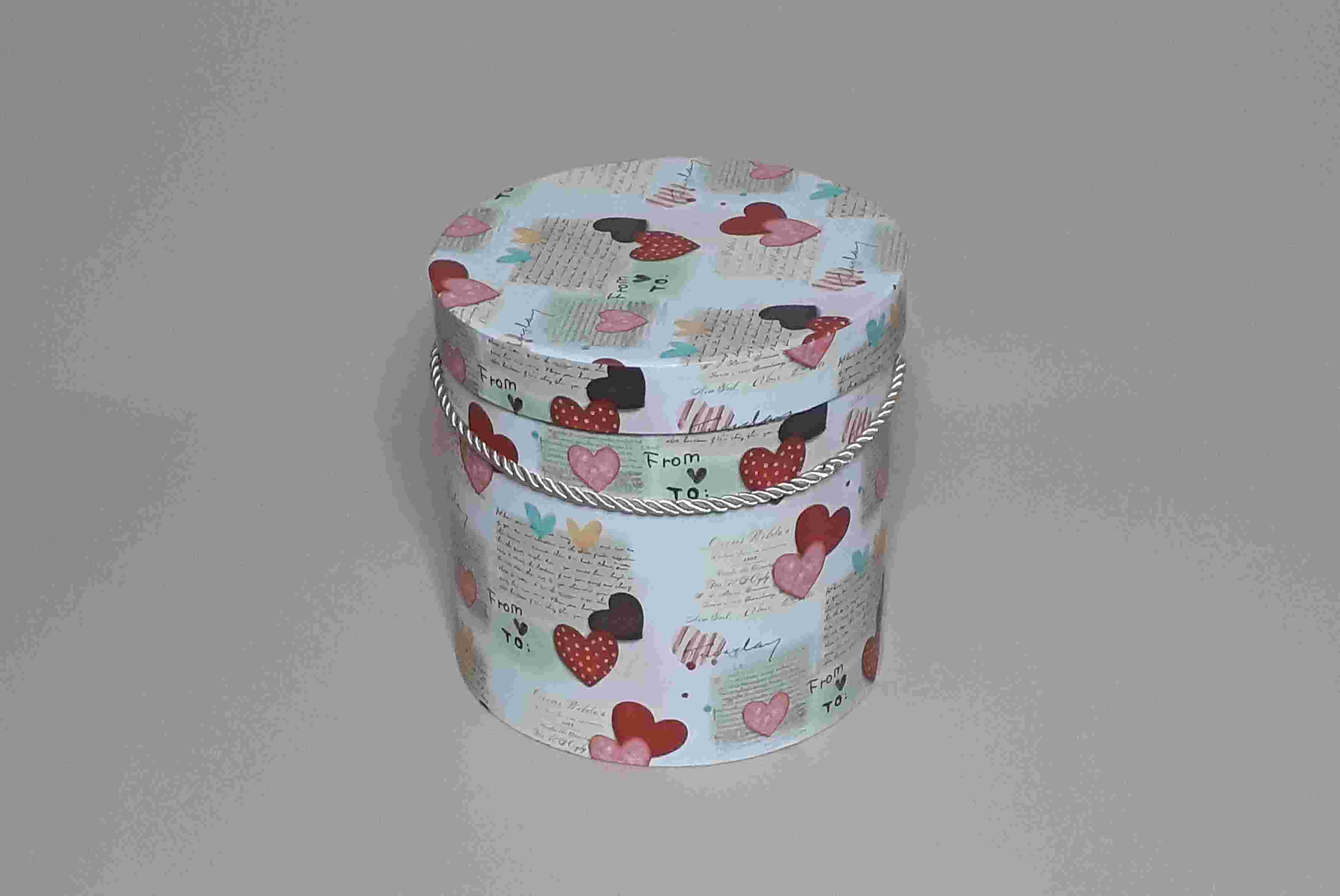 Коробка цилиндр, сердечки на белом 18х17,2 см.
